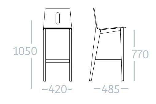 Les dimensions totales du tabouret sont de 1050 mm en hauteur, 420 mm en largeur et 485 mm en profondeur.
