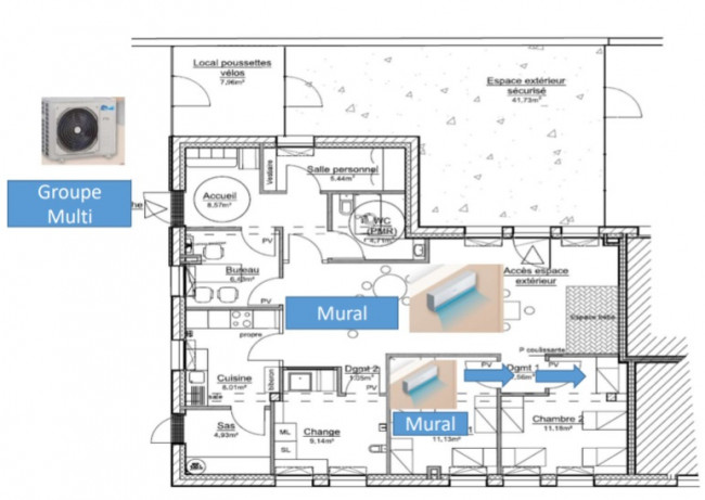 - Fourniture et pose d’une unité Gainable raccordée à des bouches de soufflage dans espace d’activité (possibilité de prévoir des bouches de soufflage dans d’autres pièces type bureau, entrée, salle personnel) soit en :