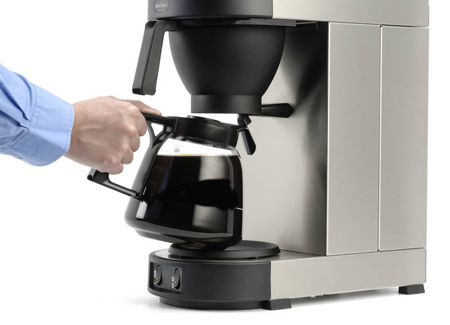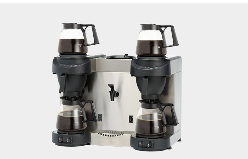 Une cafetière filtre équipée de 4 verseuses en verre 1,8 litre, 4 plaques de maintien en température, et rampe-égouttoir devant le chauffe-eau.
