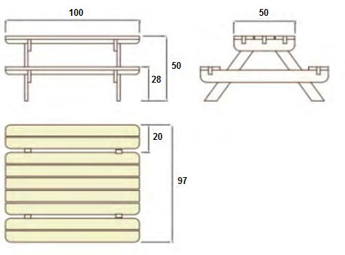 Elle mesure 100 cm de long et se caractérise par une hauteur d'assise de 28 cm et une hauteur de table de 50 cm.