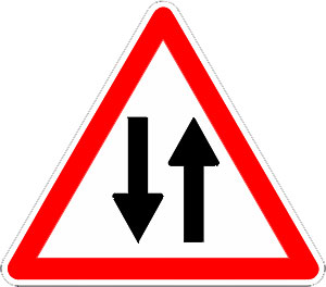 Ce panneau de signalisation routière type A18 annonce à l'automobiliste le début d'une circulation à double sens.