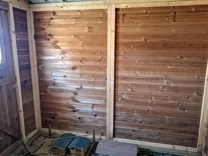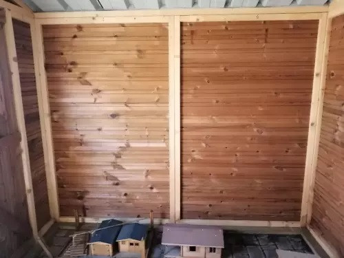 - Panneaux pré-montés de planches rabotées avec rainure et languette épaisseur 19 mm fixées sur cadre section 45 x 30 mm