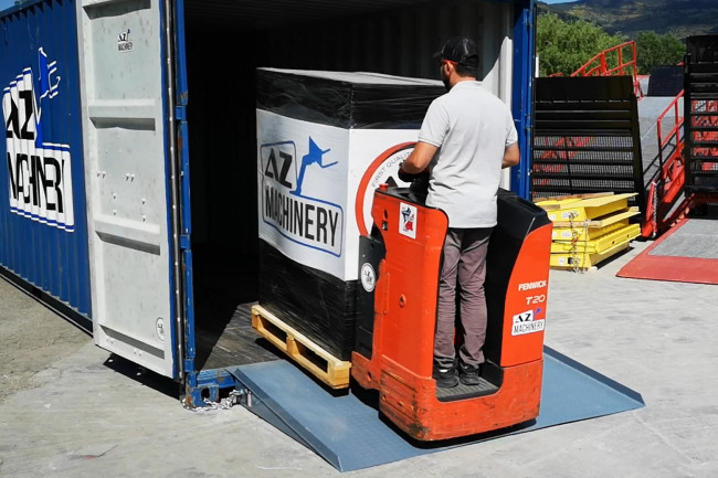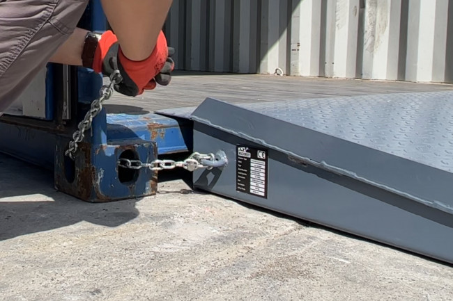 Rampe d’accès pour conteneur au sol, déplaçable pour des opérations de chargement / déchargement rapides de conteneurs. Posée à même le sol, cette rampe en acier permet de pénétrer rapidement à l'intérieur des conteneurs avec tout type de moyen de manutention (chariot élévateur, transpalette, gerbeur, et tout autre matériel roulant) Cette rampe se déplace facilement grâce aux deux fourreaux de fourche disposés sur sa face supérieure à l'aide d'un chariot élévateur. Ces fourreaux sont escamotables rapidement dans le plancher et obstruent l'orifice pour un passage sans à-coups des matériels de magasinage. Numéro UN des ventes auprès des importateurs / exportateurs depuis plus de 10 ans.