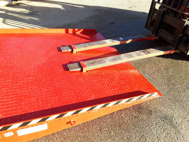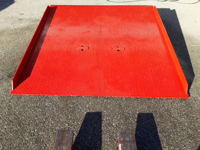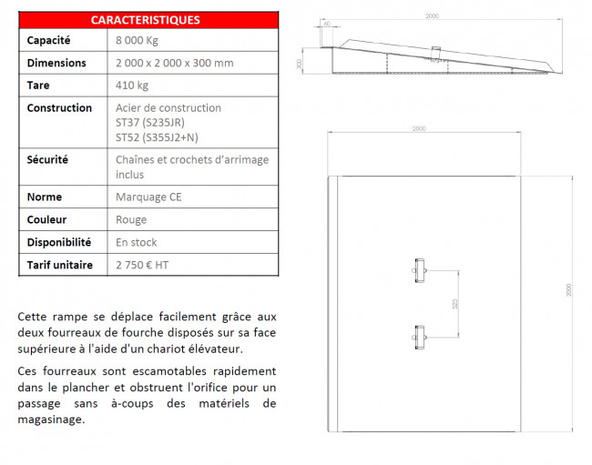 Rampe d'accès pour benne posée au sol. Cette rampe est un dispositif essentiel pour faciliter le chargement et le déchargement en toute sécurité. Fabriquée en acier robuste, elle offre une résistance optimale aux intempéries et aux charges lourdes. Son profil incliné en pente douce assure une transition en douceur entre le sol et la benne, minimisant ainsi les risques de chocs ou de dommages aux pneus des engins de manutention. Grâce à sa conception antidérapante, elle garantit l'adhérence nécessaire. En outre, ses bords latéraux relevés procurent une sécurité supplémentaire en empêchant les débordements latéraux et les chutes éventuelles.
