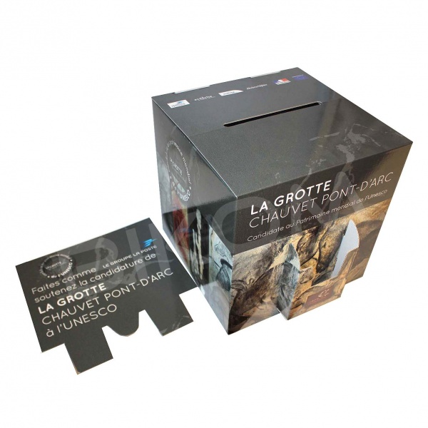 J"aurais besoin de 5 urnes en cartons personnalisables 300x300mm + porte flyers/brochures devant.