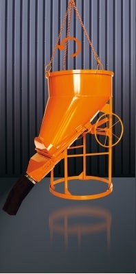 Cette benne à vidage latéral est équipé d'un embout pour tuyau de goulotte ainsi qu' un système de fermeture commandé par volant.