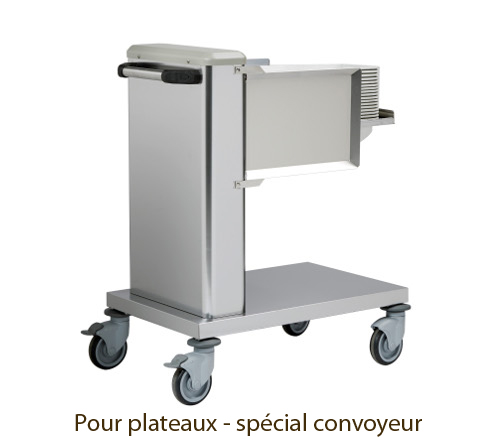 - Equipé de 2 parois latérales en inox 1,5 mm d'épaisseur pour guidage des plateaux en fin de convoyeur