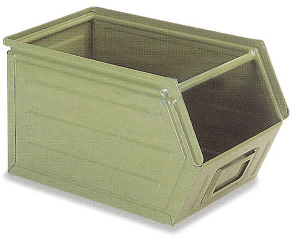 Bac à bec métal industriel robuste pour le stockage en production, équipé d’une barre de manutention, et des bords roulés pour un maximum de sécurité.