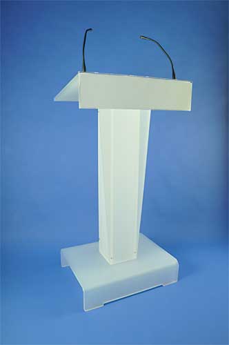 Ce pupitre de conférence est réalisé en Plexiglas épais dépoli satiné permettant le passage des câbles des micros dans la colonne en toute discrétion et évitant les reflets du flash et des projecteurs ainsi des traces de doigts.