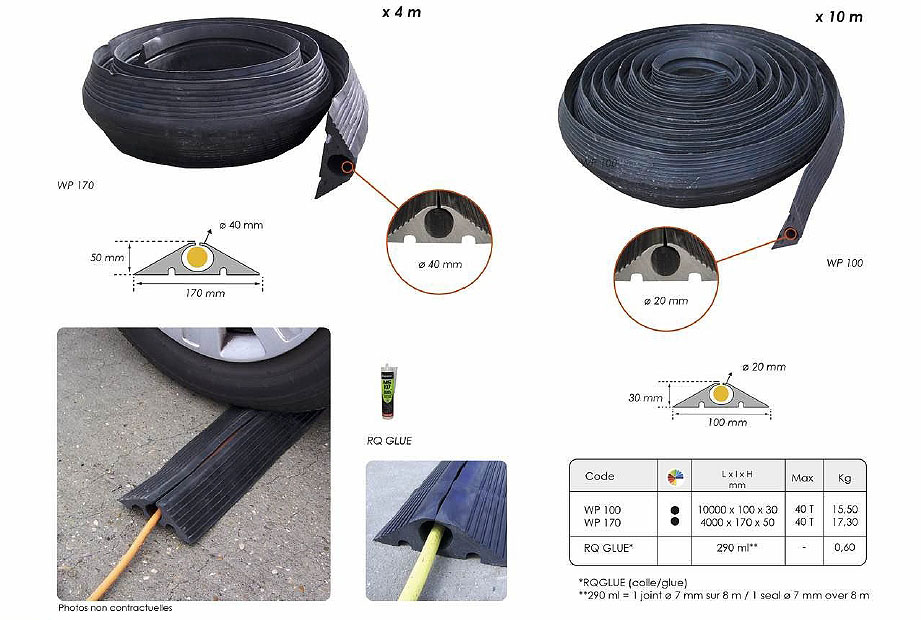 Fabriqués en caoutchouc, ces protèges câbles sont disponibles en rouleaux de 10 m ou de 4 m.