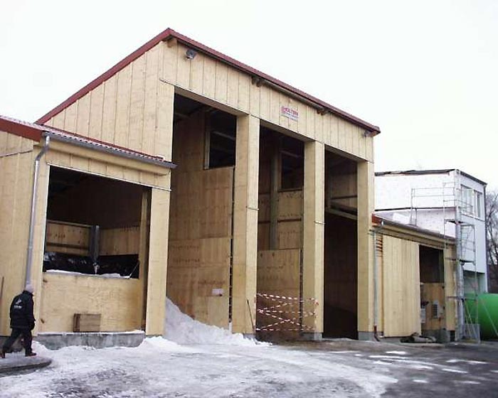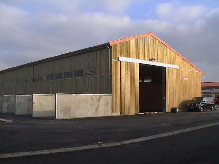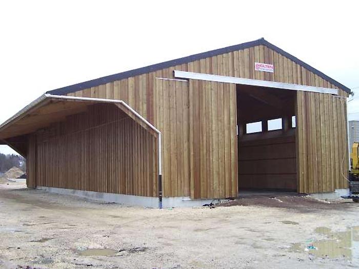 En bois de longueur de 30 m et de largeur de 13 m avec auvent de 4 m bardé sur trois côtés et deux portes sous l"auvent sur deux passer