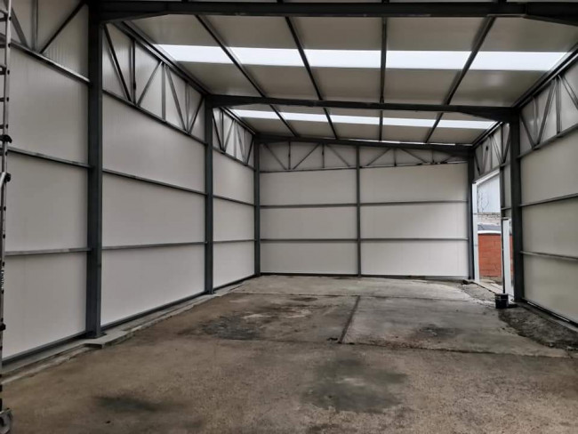 Hangars en structure métallique en fer avec traitement antirouille et thermolaqué, avec couverture et façades en panneau sandwich avec possibilité d'utiliser un autre matériau, nous fabriquons les hangars sur mesure.