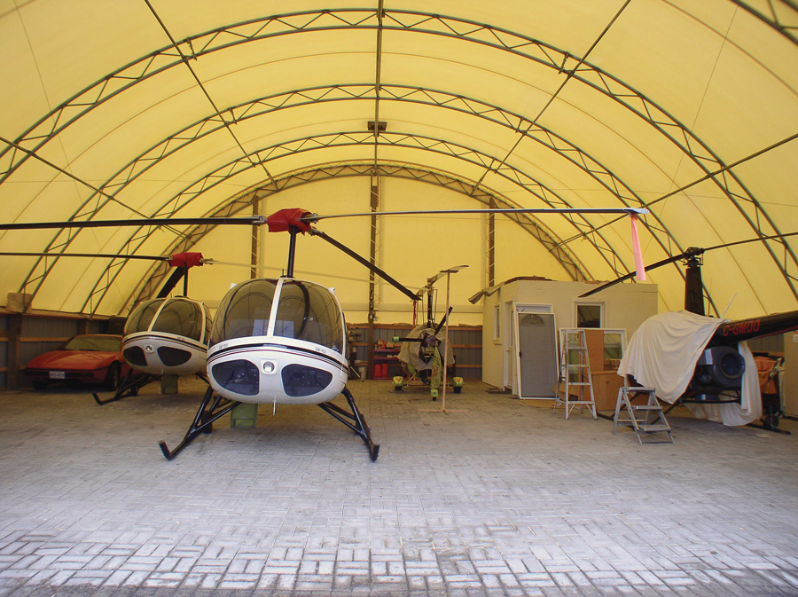 Je cherche à hangarer 3 hélicoptères légers (longueur 8 m, diam rotor 7,2 m, hauteur 2,5 m). Pas de maintenance prévu, juste mise à l"abri dans une structure légère fermée.