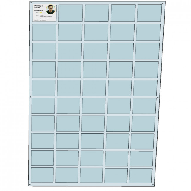 Le panneau porte fiches intègre une structure organisée en 5 rangées de 10 emplacements, offrant une présentation documents claire et professionnelle. Cette configuration permet une lecture fluide et une identification rapide des informations affichées.