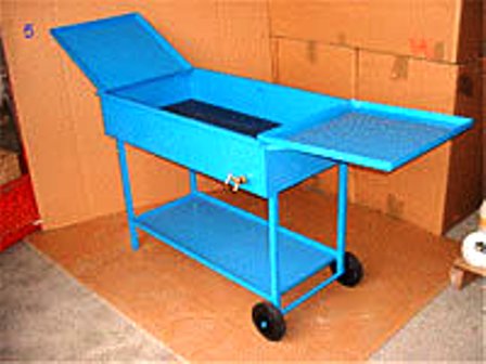 Le couvercle est constitué en 2 parties rabattables conçues de manière à vous procurer plus d´espace au niveau du plan de travail. Très solide puisque chaque partie supporte une charge de 20 Kg, par exemple vous pouvez égoutter vos pièces après les avoir nettoyées. La tablette du chariot sous le bac permet le stockage de pièces, d´organiser le classement de vos divers accessoires. Le déplacement du bac, est facilité par : 2 roues et 2 poignées de chaque côté du bac.