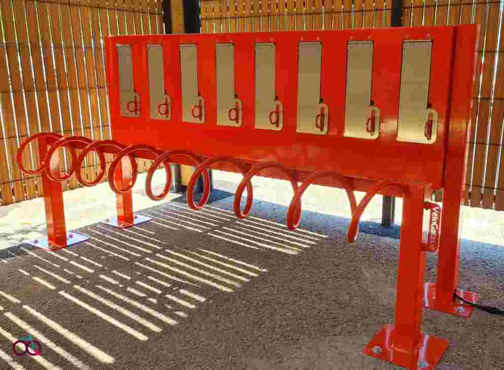 Disponible en version 4 ou 8 places, il permet de sécuriser chaque trottinette grâce à ses spirales et sa barre transversale, tout en offrant une borne de recharge intégrée via des prises étanches IP55.
