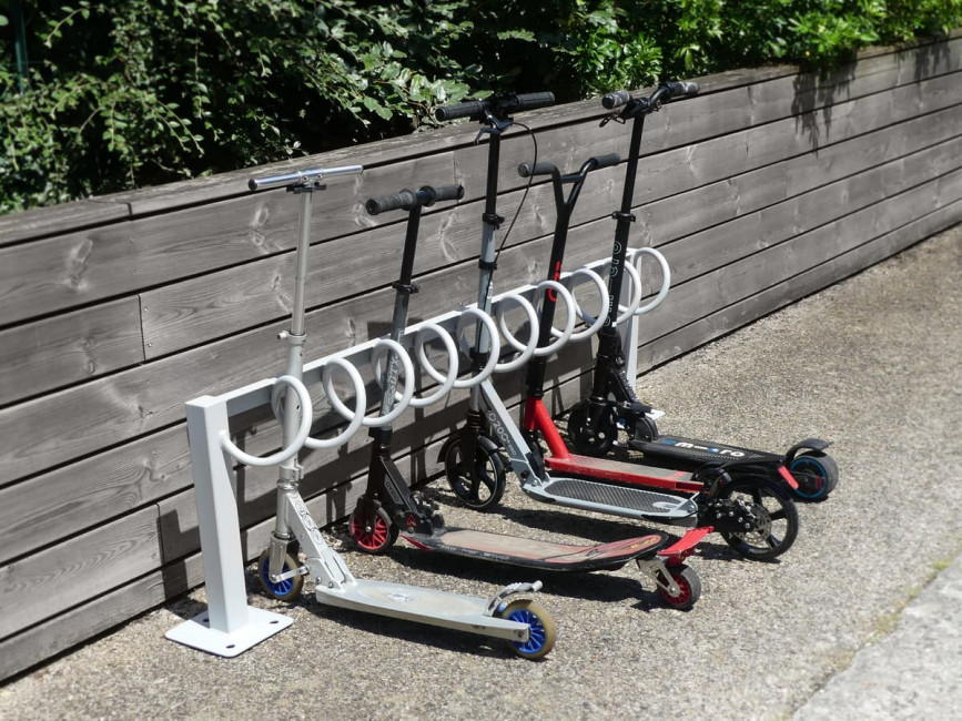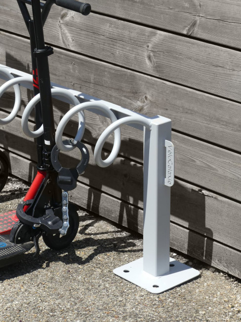 L’entraxe des spirales permet le rangement des trottinettes classiques et électriques, adultes comme enfants.