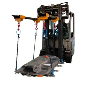 Conçu par Re-source, ce système d'élingage est spécifiquement adapté à la manipulation des batteries et convient à tous les modèles existants.