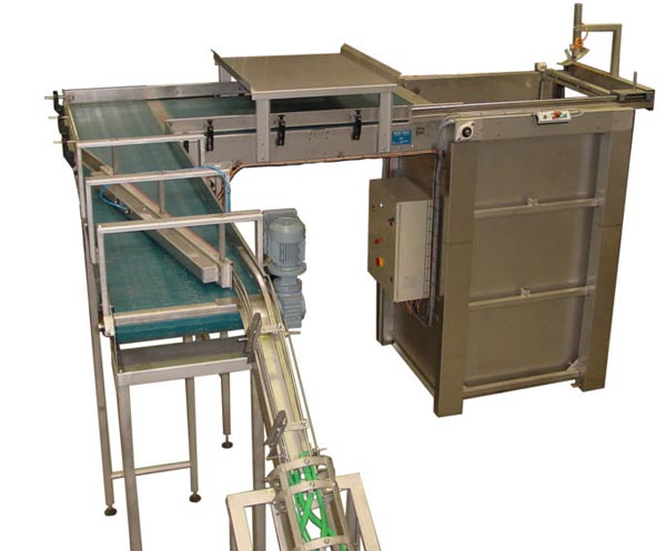 - Le réalignement des boîtes se fait au moyen d’un réaligneur à 90° doté d’un agitateur pneumatique.