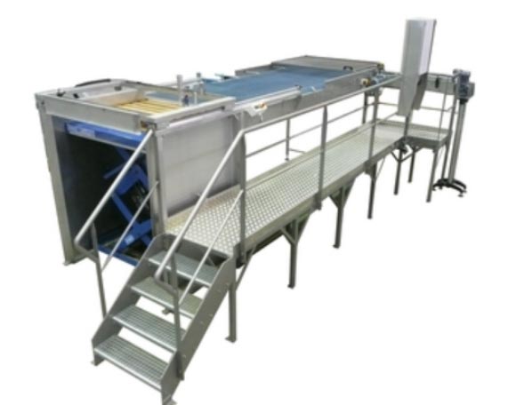 - Celles-ci sont alors évacuées sur une table d’accumulation à l’aide d’un râteau actionné manuellement.