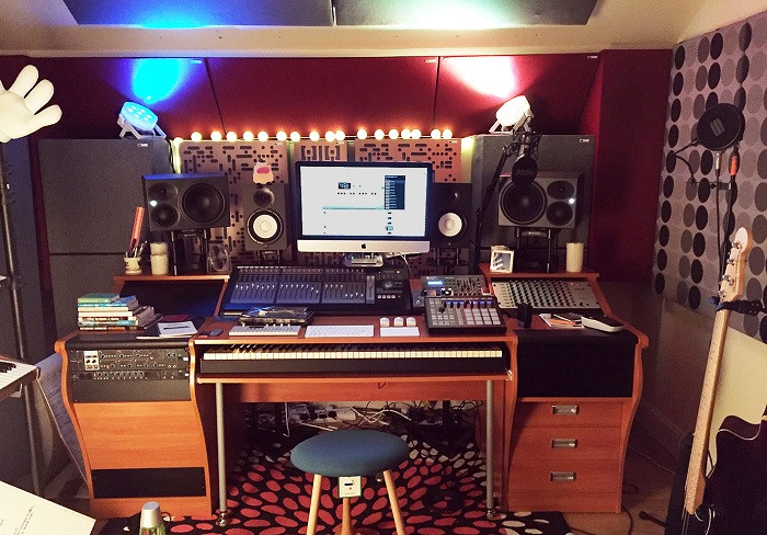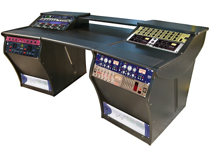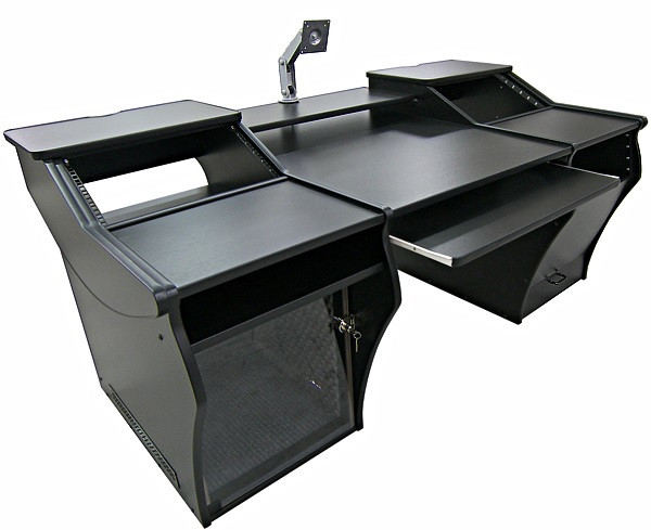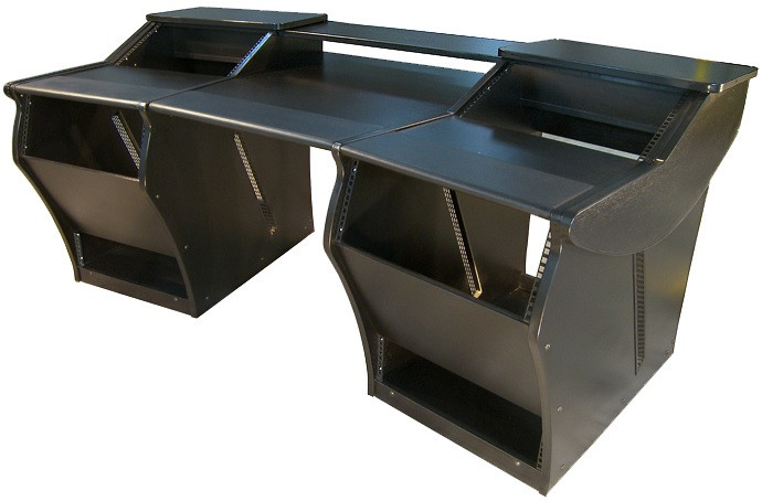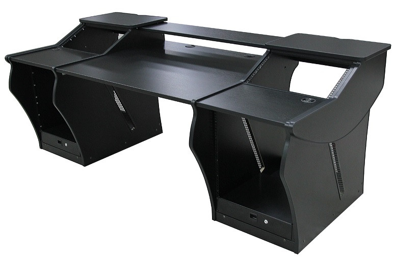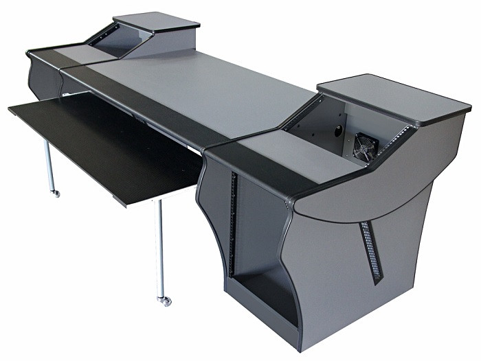 Bonjour. Vous voyez le bureau de la grande régie du studio dont je vous partage le lien ? (https://bga-studios.com/#) J"aurais besoin du même, sans les étagères avec rack 9U sur la table. Toutefois, j"aimerais beaucoup avoir la possibilité d"ajouter ces racks une fois que j"aurais les périphériques pour les garnir (éventuellement avec un système de type trous + chevilles ?) Un bureau sur roulettes avec passe-câbles et chanfrein, 2x 3U en étagère sur la table principale, et deux tables latérales avec, en bas à gauche, un rangement et, en bas à droite, un rack 9U