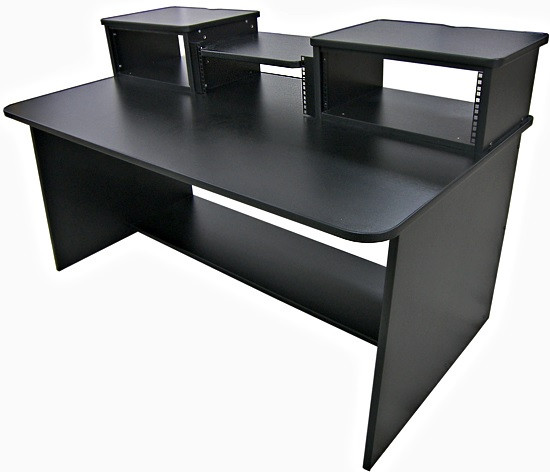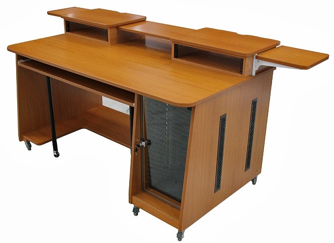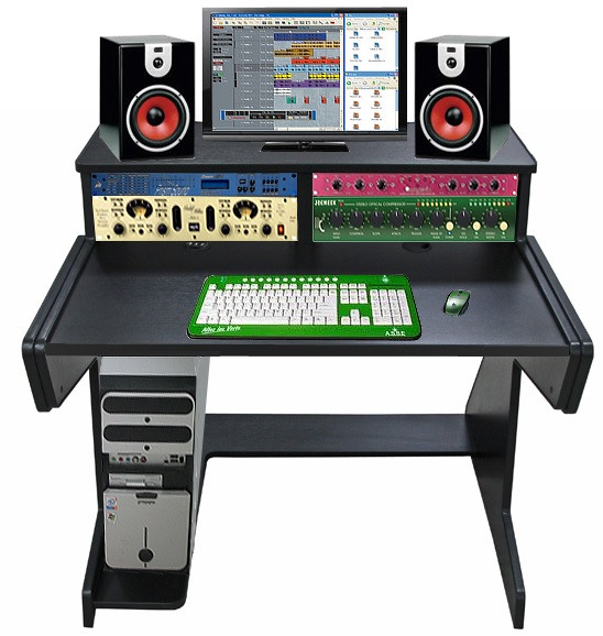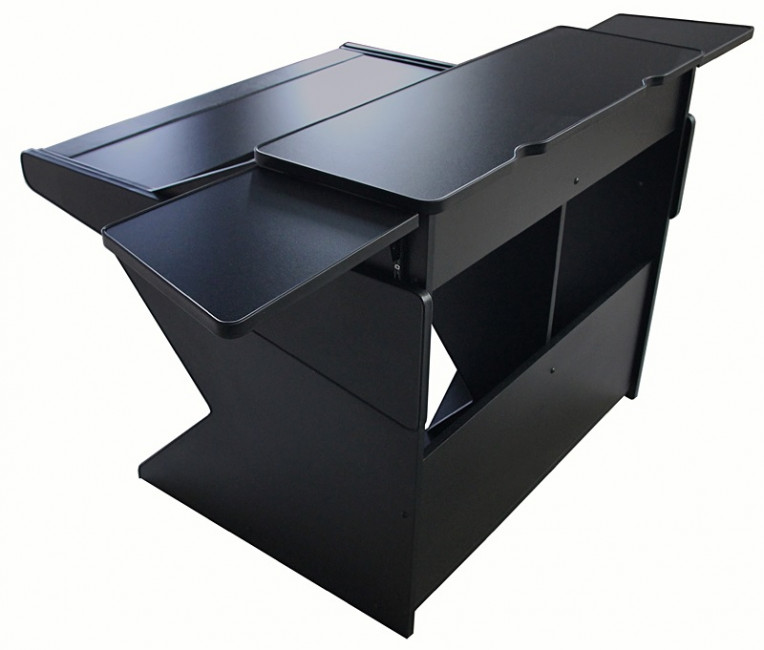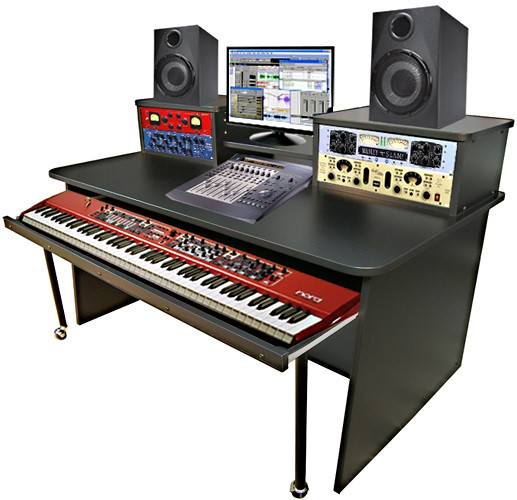 un bureau pour home studio musique avec table de mixage Tascal modele 12 à poser sur la table + étagère coulissante avec synthé Korg Wavestate SE + étagère supérieure avec écran en central et enceintes monitoring sur les côtés [300mm de profondeur]