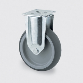 Roulette fixe, Chape en acier, zingué, Corps de roue polypropylène, Bandage : caoutchouc thermoplastique, gris non tachant, moyeu lisse, Fixation à platine