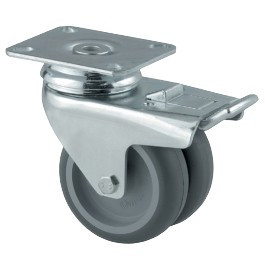 - Roulette pivotante à blocage total suiveur, Monture en acier embouti, Finition zinguée, Pivot sur double chemin de billes, Axe boulonné.