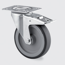 Roulette pivotante à blocage total suiveur, Monture en acier embouti, Finition zinguée, Pivot sur double chemin de billes, Axe boulonné.