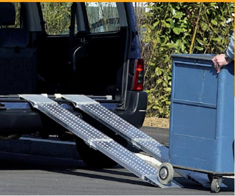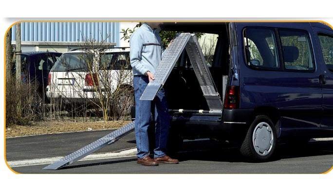 Rampe de chargement articulée et repliable en deux parties pour véhicule utilitaire ou fourgon.