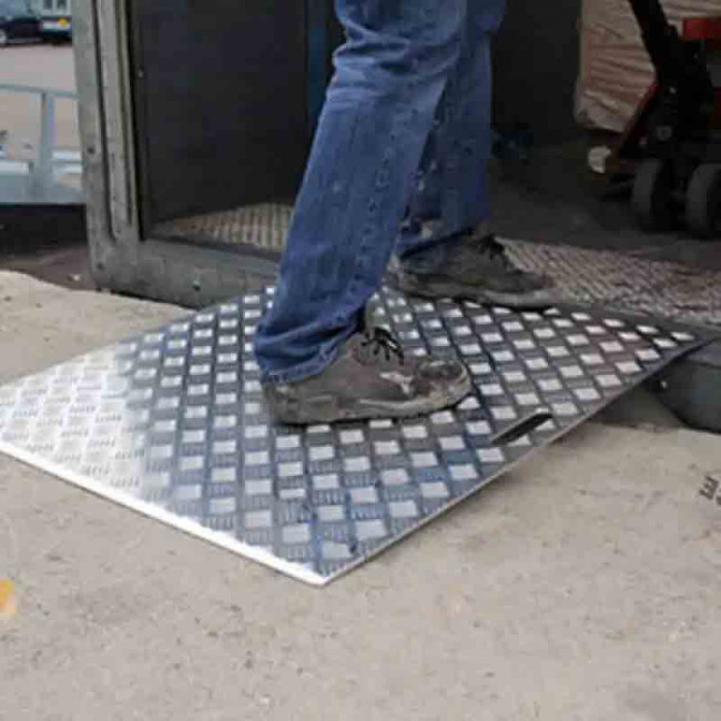 Rampe avec damier aluminium, possède une surface de roulement antidérapante.