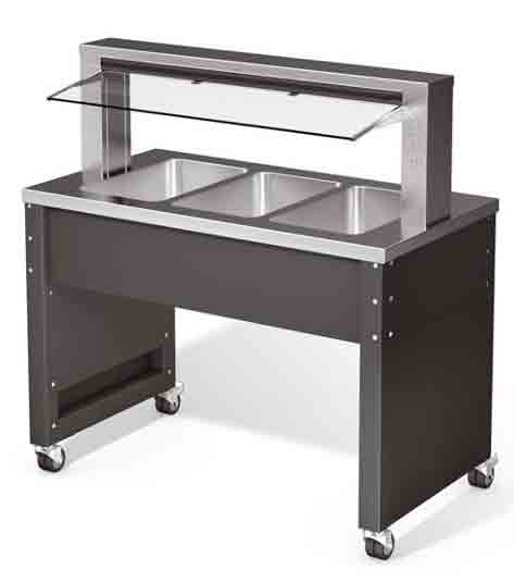 Ce buffet self service chauffant est un chariot conçu pour le transport et la distribution des repas, avec le maintien au chaud ou la régénération de repas fraîchement préparés.