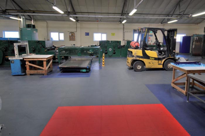 1000 m² sol dalle ciment dégradée - utilisation atelier menuiserie transpalettes + chariot-élévateur 3t5 Coloris différents pour tracer un plan de circulation