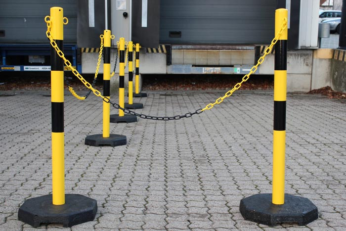 Acier Kit de 6 poteaux, 6 socles et 25 m chaîne Utilisation extérieure et intérieure Coloris : jaune-noir ou rouge-blanc
