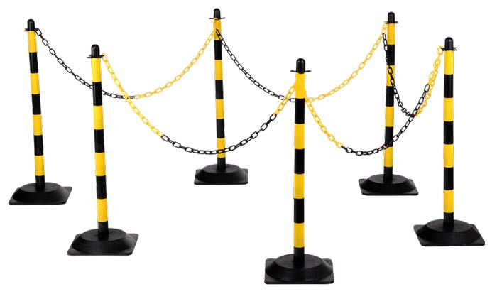 Il est composé de 6 poteaux (Ø 40 mm) avec œillets de fixation et d’une chaîne en plastique d’une longueur totale de 10 m.