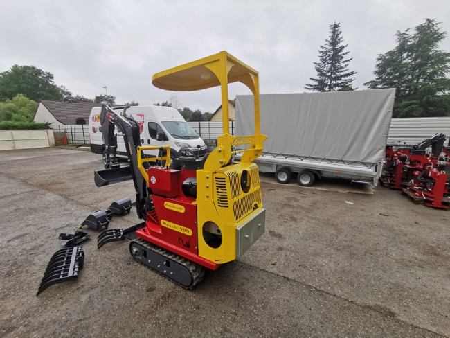Modèle haut de gamme toutes options en largeur de 83cm, cette micro pelle possède une tourelle tournant à 360° avec un pied de flèche 110° permettant de travailler en déporté (à raz d’un mur par exemple), deux lignes hydraulique dont une en grand débit indépendante permettant d’utiliser un accessoire hydraulique sans perte de mouvement comme un taille haies par exemple.