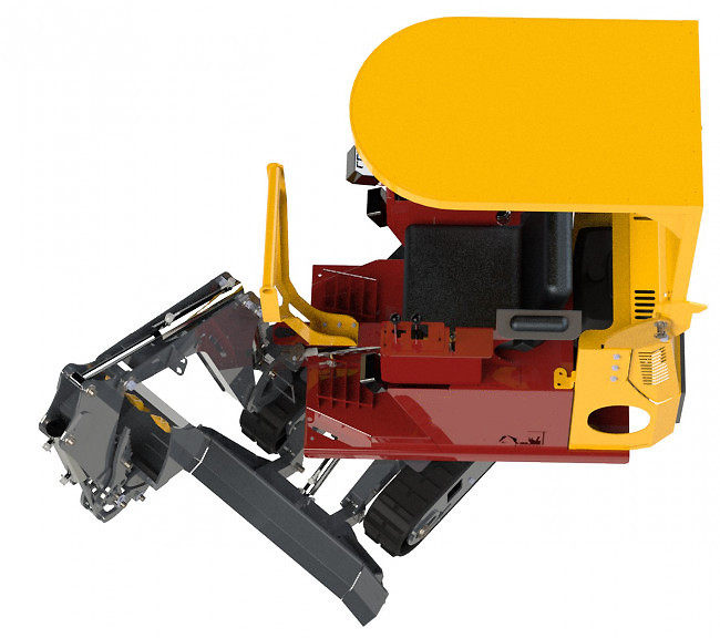 Modèle milieu de gamme de la série Micro Pelle en largeur de 83cm, la Micro Pelle, possède une tourelle tournant à 360° avec un pied de flèche 110° permettant de travailler en déporté (à raz d’un mur par exemple).
