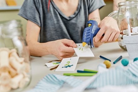 Petit pistolet à colle très fiable et polyvalent grâce à son cordon amovible.