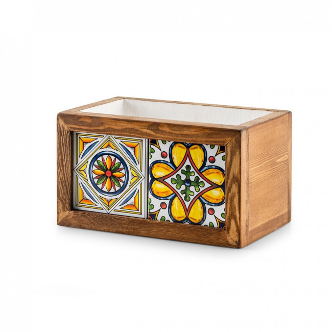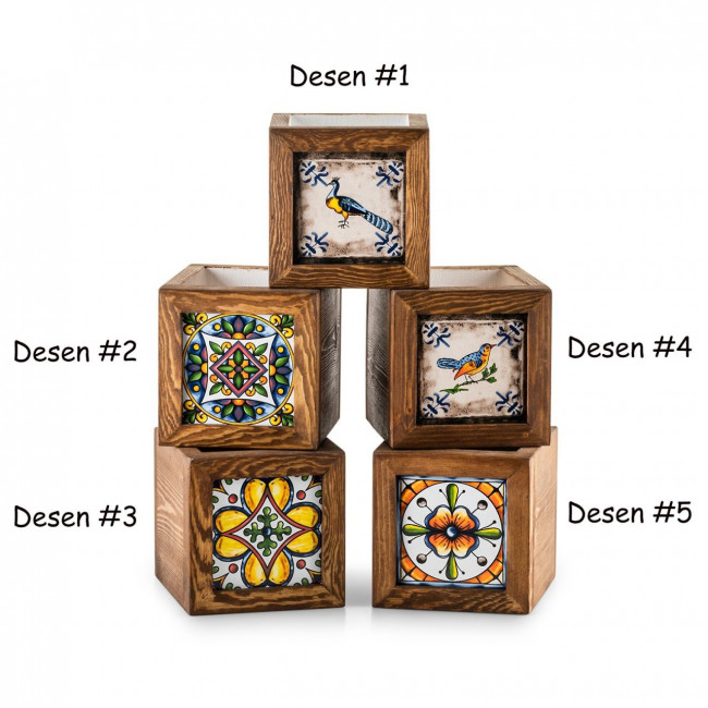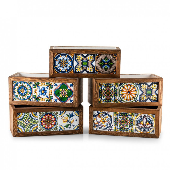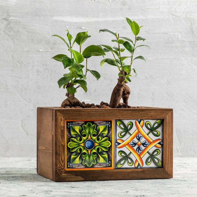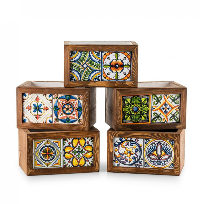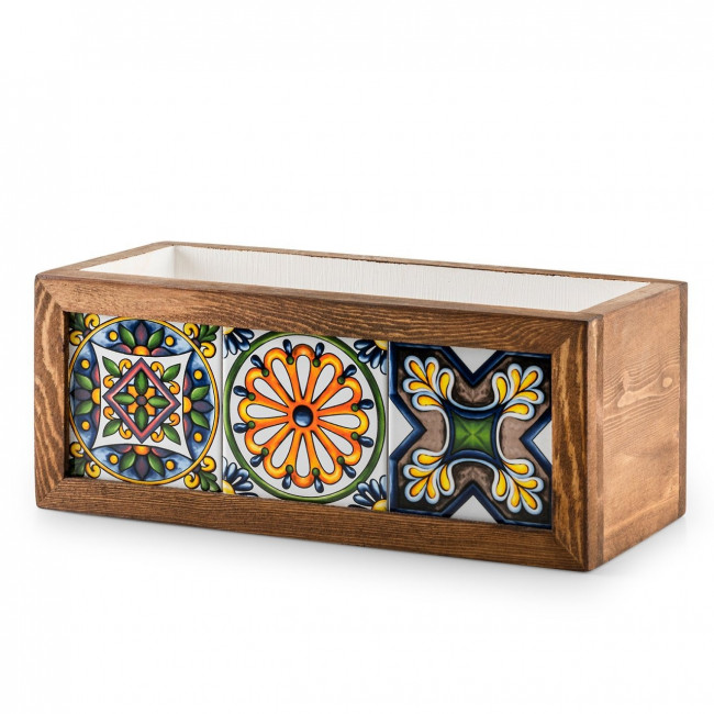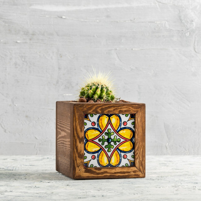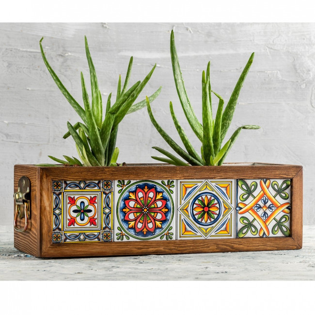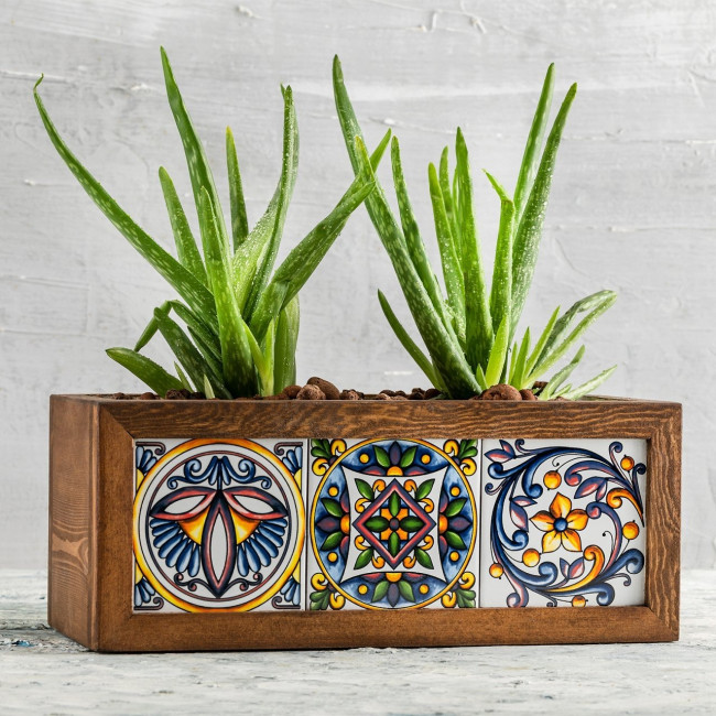 Ces pots de fleur en bois carrelé mexicain incarnent l'union entre la beauté naturelle du bois et les éclats de couleurs des carreaux à motifs mexicains.