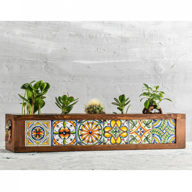 Les 6 morceaux de carreaux à motifs mexicains de 10 x 10 cm ajoutent une touche d'exotisme et de couleur au-devant du pot, créant un contraste saisissant avec la texture naturelle du bois.