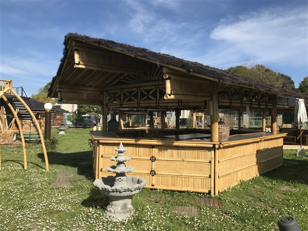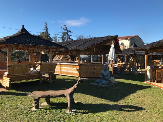 - Sous la toiture est installé un grand porte-verre en bambou ainsi qu’une grande table centrale