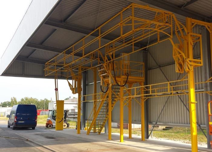 Dans le cadre de notre activité, nous sommes amenés à décharger régulièrement des conteneurs d’huile de friture usagée. Pour cela, les opérateurs doivent avoir accès au-dessus des conteneurs pour prendre des échantillons et ouvrir les évents pour le déchargement. L"objectif est d"installer une passerelle fixe avec 3 postes basculants, en effet l"accès aux trappes trou d"homme et évents varie en fonction de la longueur du chassis.