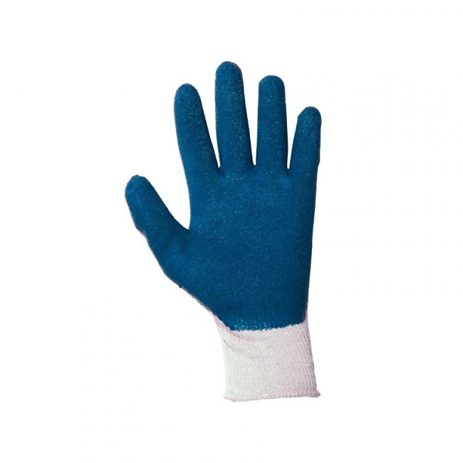 Ces gants de manutention blanc et bleu en maille polycoton, ainsi que d’une enduction en latex naturel.
