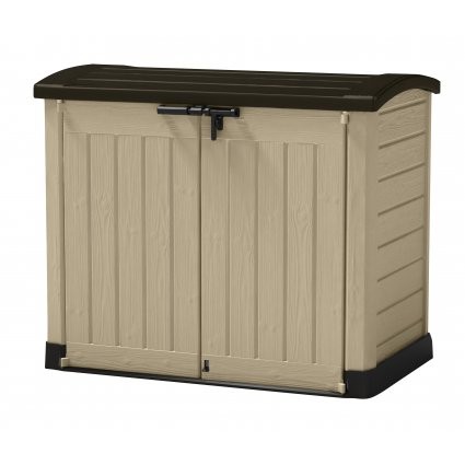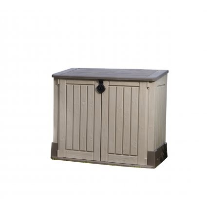 Remarque : grâce ses grandes capacités et une ouverture frontale par portes et par le dessus avec couvercle, ce coffre permet le rangement d'objets avec grands volumes. (vélos - poubelles...)