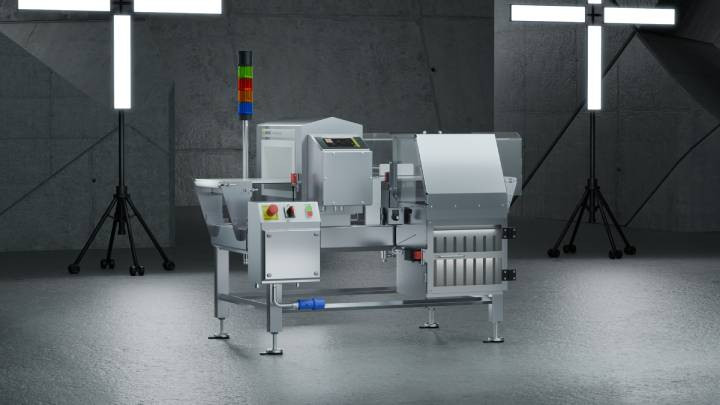Ce système tout-en-un associe un détecteur de métaux, un convoyeur à bande et un dispositif de rejet en option.
