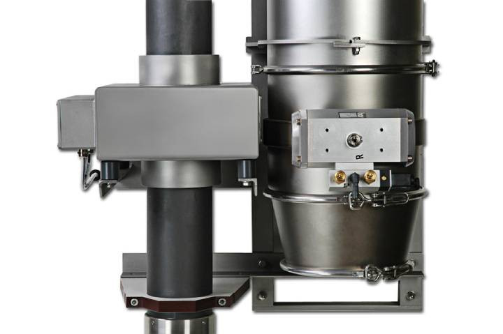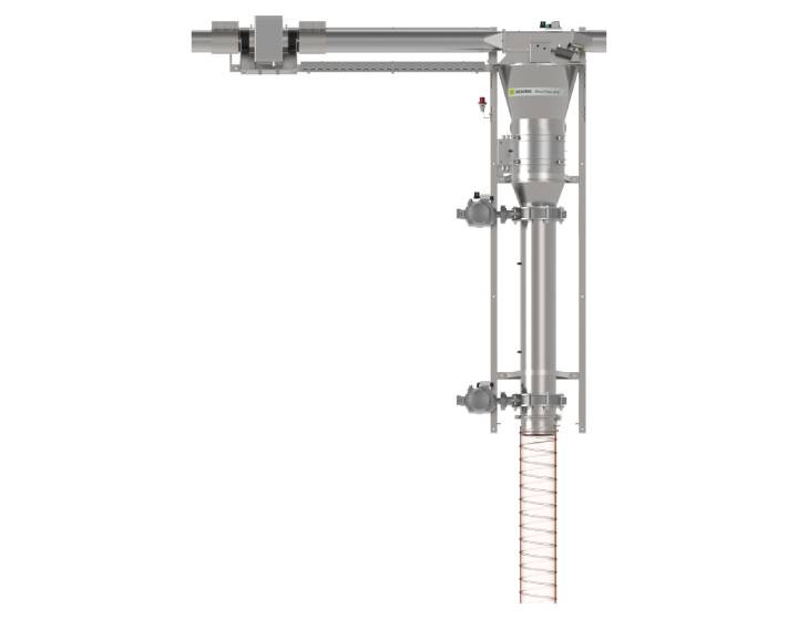 Avec ses raccords rapides et ses brides, il s’intègre directement aux systèmes de transport pneumatique standard jusqu’à 150 mm de diamètre.