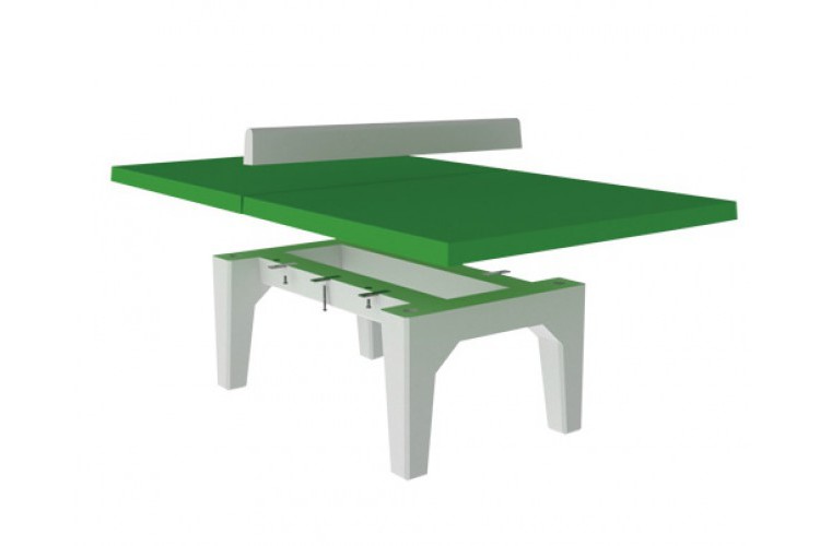 La finition du piètement et du filet est en béton blanc lisse et la finition des plateaux est en béton gris lisse peint en vert.