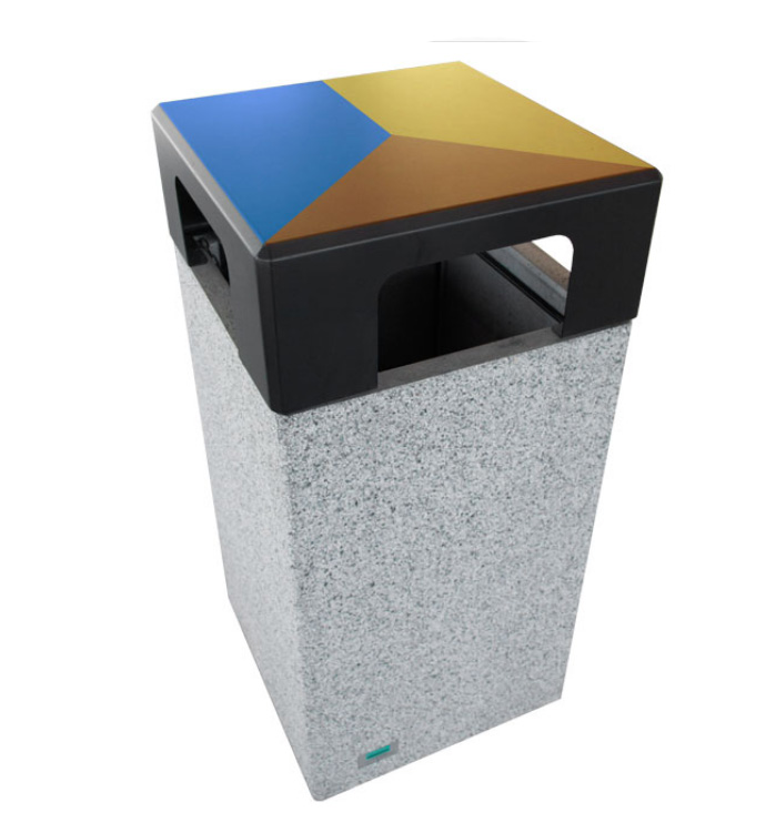 | Réf. TC :161986151 | Corbeille Kube tri sélectif en béton préfabriqué | 55L+55L+30L | L 500 x l 500 x H 1085 mm | Bleu/Jaune/marron | -