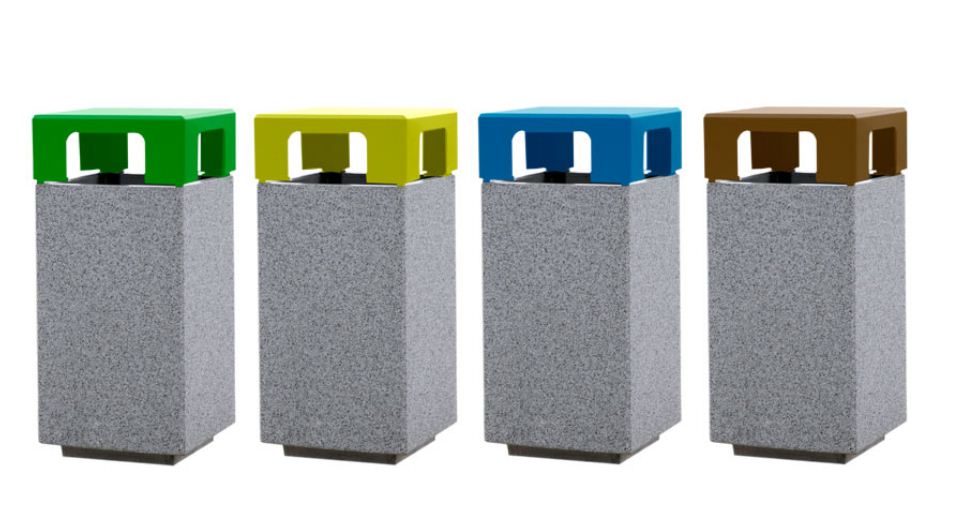 corbeille Kube tri sélectif en béton préfabriqué gris pousse les gens à faire des gestes écologiques en triant leurs déchets.