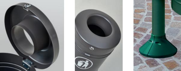 Disponible en plusieurs finitions (RAL 8017, RAL 6005, RAL 9005, etc.) et avec plusieurs options de personnalisation (pommeaux City, Agora, Boule ou Inox brossé), cette poubelle s'intègre facilement dans tous types d'espaces urbains.